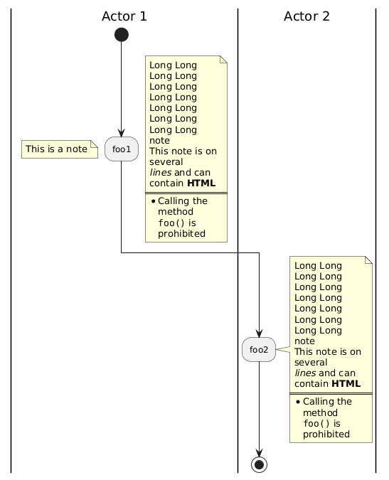 @startuml skinparam wrapWidth 100 |Actor 1| start :foo1; note right Long Long Long Long Long Long Long Long Long Long Long Long Long Long note This note is on several //lines// and can contain <b>HTML</b> ==== * Calling the method ""foo()"" is prohibited end note floating note left: This is a note |Actor 2| :foo2; note right Long Long Long Long Long Long Long Long Long Long Long Long Long Long note This note is on several //lines// and can contain <b>HTML</b> ==== * Calling the method ""foo()"" is prohibited end note stop @enduml