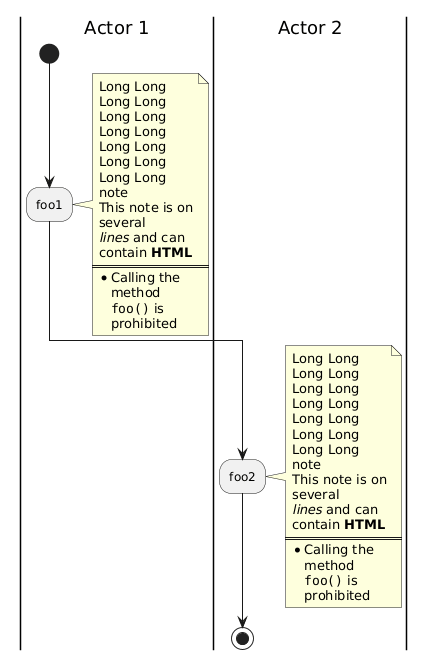 @startuml skinparam wrapWidth 100 |Actor 1| start :foo1; note right Long Long Long Long Long Long Long Long Long Long Long Long Long Long note This note is on several //lines// and can contain <b>HTML</b> ==== * Calling the method ""foo()"" is prohibited end note |Actor 2| :foo2; note right Long Long Long Long Long Long Long Long Long Long Long Long Long Long note This note is on several //lines// and can contain <b>HTML</b> ==== * Calling the method ""foo()"" is prohibited end note stop @enduml