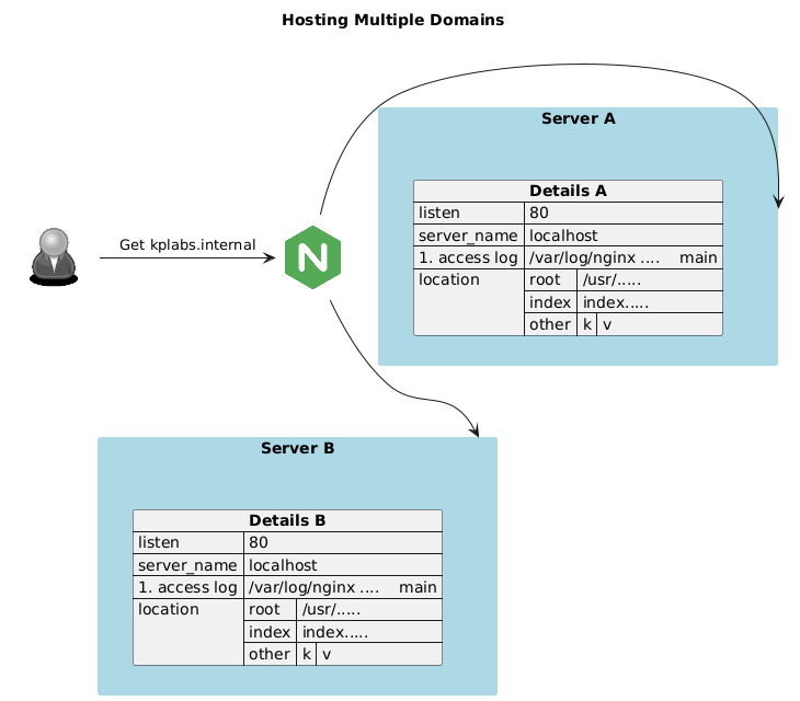 @startuml !include <logos/nginx> !include <osa/user/blue/blue> hide stereotype skinparam rectangle { BorderColor transparent BackgroundColor transparent } skinparam rectangle<<server>> { BackgroundColor lightblue } title "Hosting Multiple Domains" rectangle "<$blue,scale=0.5>" as P rectangle "<$nginx,color=green>" as N rectangle "Server A" <<server>> as A { json "<b>Details A" as A_Details { "listen": 80, "server_name": "localhost", "#access log": "/var/log/nginx .... main", "location": { "root": "/usr/.....", "index": "index.....", "other": {"k": "v"} } } } rectangle "Server B" <<server>> as B { json "<b>Details B" as B_Details { "listen": 80, "server_name": "localhost", "#access log": "/var/log/nginx .... main", "location": { "root": "/usr/.....", "index": "index.....", "other": {"k": "v"} } } } P -right-> N : "Get kplabs.internal" N -right-> A : "" N -right-> B : "" A -[hidden]down-> B @enduml