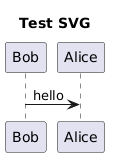 @startuml !define FILE_FORMAT_SVG 1 !ifdef FILE_FORMAT_SVG title Test SVG !else !ifdef FILE_FORMAT_PNG title Test PNG !else title Test with unknown type !endif !endif Bob -> Alice : hello @enduml