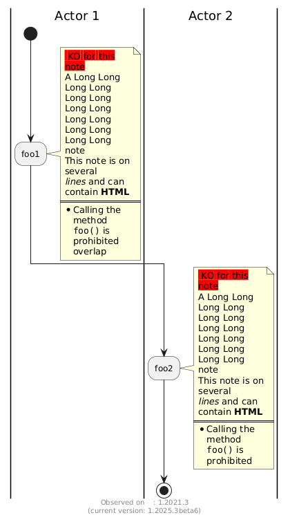 @startuml <style> activityDiagram { note { MaximumWidth 100 } } </style> |Actor 1| start :foo1; note right <back:red> KO for this note A Long Long Long Long Long Long Long Long Long Long Long Long Long Long note This note is on several //lines// and can contain <b>HTML</b> ==== * Calling the method ""foo()"" is prohibited overlap end note 'floating note left: This is a note |Actor 2| :foo2; note right <back:red> KO for this note A Long Long Long Long Long Long Long Long Long Long Long Long Long Long note This note is on several //lines// and can contain <b>HTML</b> ==== * Calling the method ""foo()"" is prohibited end note stop footer Observed on : 1.2021.3\n(current version: %version()) @enduml