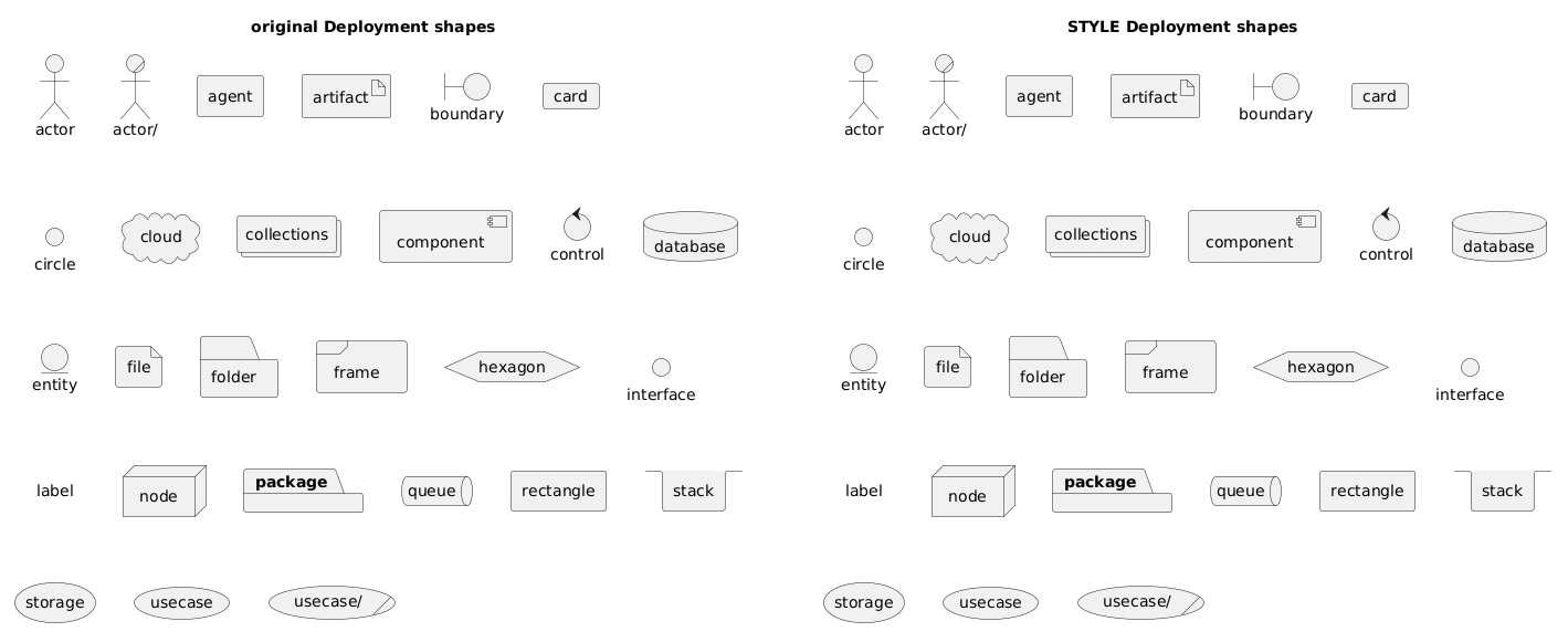 @startuml label A [ {{ title original Deployment shapes actor actor actor/ "actor/" agent agent artifact artifact boundary boundary card card circle circle cloud cloud collections collections component component control control database database entity entity file file folder folder frame frame hexagon hexagon interface interface label label node node package package queue queue rectangle rectangle stack stack storage storage usecase usecase usecase/ "usecase/" }} ] label B [ {{ <STYLE> </STYLE> title STYLE Deployment shapes actor actor actor/ "actor/" agent agent artifact artifact boundary boundary card card circle circle cloud cloud collections collections component component control control database database entity entity file file folder folder frame frame hexagon hexagon interface interface label label node node package package queue queue rectangle rectangle stack stack storage storage usecase usecase usecase/ "usecase/" }} ] @enduml