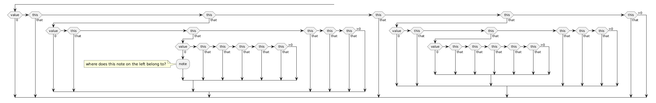@startuml if (value) then (0) note It would be nice if this note would appear next to the if statement pointing towards it end note elseif (this) then (that) elseif (this) then (that) if (value) then (0) note It would be nice if this note would appear next to the if statement pointing towards it end note elseif (this) then (that) elseif (this) then (that) if (value) then (0) note It would be nice if this note would appear next to the if statement pointing towards it end note :note; note where does this note on the left belong to? end note elseif (this) then (that) elseif (this) then (that) elseif (this) then (that) elseif (this) then (that) elseif (this) then (that) else (>0) endif elseif (this) then (that) elseif (this) then (that) elseif (this) then (that) else (>0) endif elseif (this) then (that) elseif (this) then (that) if (value) then (0) note It would be nice if this note would appear next to the if statement pointing towards it end note elseif (this) then (that) elseif (this) then (that) if (value) then (0) note It would be nice if this note would appear next to the if statement pointing towards it end note elseif (this) then (that) elseif (this) then (that) elseif (this) then (that) elseif (this) then (that) elseif (this) then (that) else (>0) endif elseif (this) then (that) elseif (this) then (that) elseif (this) then (that) else (>0) endif elseif (this) then (that) else (>0) endif @enduml