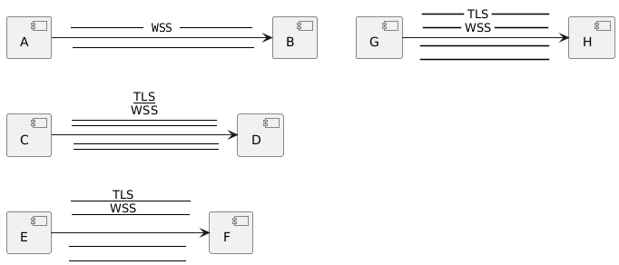 @startuml sprite $TOP[16x16/16] { 0000000000000000 0000000000000000 0000000000000000 0000000000000000 0000000000000000 0000000000000000 0000000000000000 0000000000000000 0000000000000000 FFFFFFFFFFFFFFFF 0000000000000000 0000000000000000 0000000000000000 0000000000000000 0000000000000000 0000000000000000 } sprite $BOT[16x16/16] { 0000000000000000 0000000000000000 0000000000000000 0000000000000000 0000000000000000 0000000000000000 0000000000000000 0000000000000000 0000000000000000 0000000000000000 FFFFFFFFFFFFFFFF 0000000000000000 0000000000000000 0000000000000000 0000000000000000 0000000000000000 } sprite $TOP2[16x16/16] { 0000000000000000 0000000000000000 0000000000000000 FFFFFFFFFFFFFFFF 0000000000000000 0000000000000000 0000000000000000 0000000000000000 0000000000000000 FFFFFFFFFFFFFFFF 0000000000000000 0000000000000000 0000000000000000 0000000000000000 0000000000000000 0000000000000000 } sprite $BOT2[16x16/16] { 0000000000000000 0000000000000000 0000000000000000 0000000000000000 0000000000000000 0000000000000000 0000000000000000 0000000000000000 0000000000000000 FFFFFFFFFFFFFFFF 0000000000000000 0000000000000000 0000000000000000 0000000000000000 0000000000000000 FFFFFFFFFFFFFFFF } sprite $BOT8[8x16/16] { 00000000 00000000 00000000 00000000 00000000 00000000 00000000 00000000 00000000 00000000 FFFFFFFF 00000000 00000000 00000000 00000000 00000000 } component A component B A "<font:monospaced> <$BOT><$BOT><$BOT><$BOT><$BOT><$BOT8><$BOT8><$BOT8><$BOT8><$BOT8><$BOT><$BOT><$BOT><$BOT><$BOT>" -right-> B : <font:monospaced><$TOP><$TOP><$TOP><$TOP><$TOP> WSS <$TOP><$TOP><$TOP><$TOP><$TOP> component C component D C " <font:monospaced><$BOT2><$BOT2><$BOT2><$BOT2><$BOT2><$BOT2><$BOT2><$BOT2><$BOT2><$BOT2>" -right-> D : <u>TLS</u>\nWSS\n<font:monospaced><$TOP2><$TOP2><$TOP2><$TOP2><$TOP2><$TOP2><$TOP2><$TOP2><$TOP2><$TOP2> component E component F E " <U> </U>\n <U> </U>" -right-> F : ""<U> TLS </U>\n<U> WSS </U>\n"" component G component H G " <S> </S>\n <S> </S>" -right-> H : ""<S> </S> TLS <S> </S>\n<S> </S> WSS <S> </S>"" A -[hidden]-> C C -[hidden]-> E 'E -[hidden]-> G @enduml