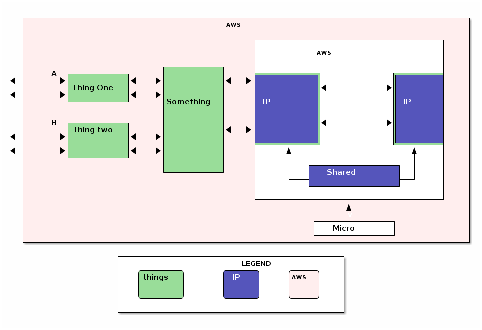 @startditaa +----------------------------------------------------------------------------------------+ | AWS | | | | +-------------------------------------+ | | | cGRE | | | | AWS | | | | | | | +-----------+ | | | | A +-----------+ | | +------------+ +---------+ | <-|------->+ +<---->+ +<--->+ | | | | | |Thing One | | | | +<------------>+ | | <-|------->+ cGRE +<---->+ | | | | | | | +-----------+ |Something | | IP | | IP | | | | | | | | | | | | cGRE | | cBLU | | cBLU | | | B +-----------+ | | | +<------------>+ | | | |Thing two | | +<--->+ | | | | <-|------->+ +<---->+ | | | | | | | | cGRE | | | +------+-----+ +---------+ | <-|------->+ +<---->+ | | ^ ^ | | | +-----------+ | | | | | | | | | | | | +-----------------+ | + | | +-----------+ | | | Shared | | | | | | +---+ cBLU +--+ | | | | +-----------------+ | | | | | | | +------------------+------------------+ | | ^ | | v | | cFEE +------+--------+ | | | Micro | | | +---------------+ | +----------------------------------------------------------------------------------------+ +--------------------------------------------+ | LEGEND | | /--------\ /------\ /-----\ | | |things | | IP | |AWS | | | |cGRE | |cBLU | |cFEE | | | | | | | | | | | \--------/ \------/ \-----/ | | cFFF | +--------------------------------------------+ @endditaa