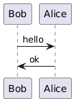 @startuml skinparam responseMessageBelowArrow true Bob -> Alice : hello Alice -> Bob : ok @enduml