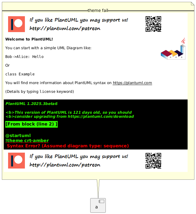 @startuml component a { } note top of a: \n==theme fail==\n{{\n!theme crt-amber\nUser->System: test\n}}\n @enduml