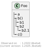 @startuml class Foo { '-- |_ a |_ b() |_ b1 |_ b2 |_ b2.1 |_ c() } footer \nObserved on : 1.2022.6beta4\n(current version: %version()) @enduml