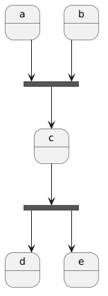 @startuml skinparam linetype ortho state a state b state c state d state f <<fork>> state j <<join>> a --> f b --> f f --> c c --> j j --> d j --> e @enduml