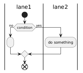@startuml /' Example diagram with uncrossed lines but unnecessary empty action '/ |lane1| start if (condition) then (no) :; else (yes) |lane2| :do something; endif |lane1| end @enduml