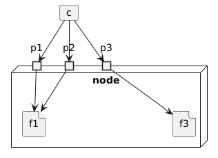 @startuml 'left to right direction card c node node { port p1 port p2 port p3 file f1 file f3 } c --> p1 c --> p2 c --> p3 p1 --> f1 p2 --> f1 p3 --> f3 @enduml