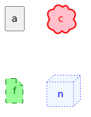 @startuml agent a cloud c #pink;line:red;line.bold;text:red file f #palegreen;line:green;line.dashed;text:green node n #aliceblue;line:blue;line.dotted;text:blue @enduml