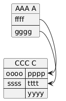 @startuml left to right direction object "AAA A" as AAAA { ffff ---- gggg } map "CCC C" as CCCC { oooo => pppp ssss => tttt => uuuu => yyyy } AAAA::fff => CCCC::oooo AAAA::gggg => CCCC::ssss @enduml
