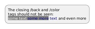 @startuml :The closing /back and /color tags should not be seen: <color:navy><back:gray><color:white>some text<color:navy> some more</back> text</color> and even more; @enduml
