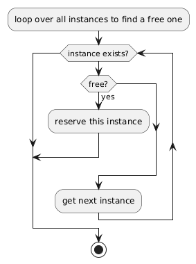 @startuml :loop over all instances to find a free one; while (instance exists?) if (free?) then (yes) :reserve this instance; break endif :get next instance; endwhile stop @enduml