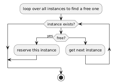 @startuml :loop over all instances to find a free one; while (instance exists?) if (free?) then (yes) :reserve this instance; break else :get next instance; endif endwhile stop @enduml