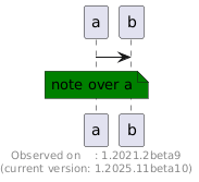 @startuml a->b <style> note { BackGroundColor green } </style> note over a: note over a footer Observed on : 1.2021.2beta9\n(current version: %version()) @enduml