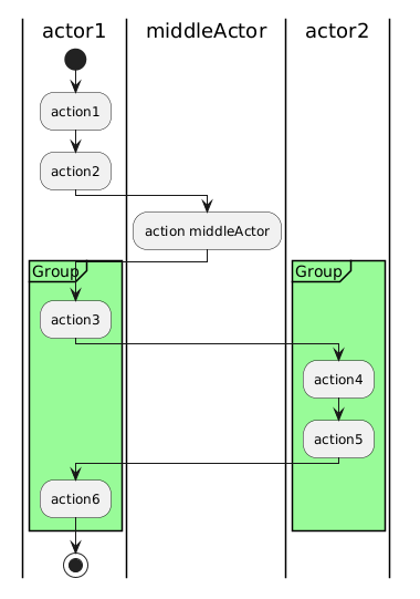 @startuml skinparam shadowing false |actor1| start :action1; :action2; |middleActor| :action middleActor; |actor1| partition Group #palegreen { :action3; |actor2| :action4; :action5; |actor1| :action6; } stop @enduml