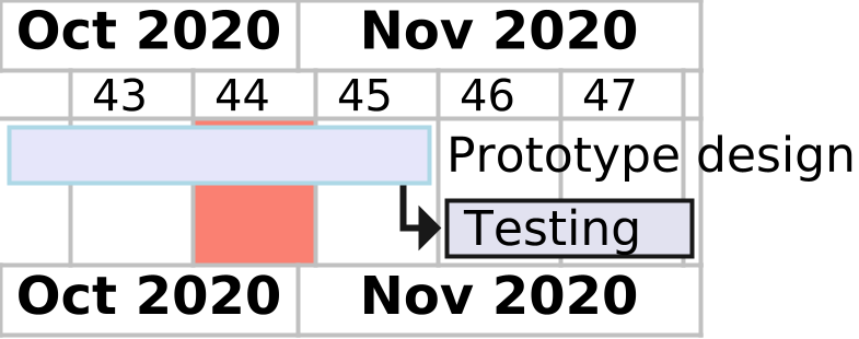 @startgantt scale 5 printscale weekly 2020/10/26 to 2020/11/01 are colored in salmon Project starts the 2020-10-15 [Prototype design] as [TASK1] lasts 25 days [TASK1] is colored in Lavender/LightBlue [Testing] lasts 15 days [TASK1]->[Testing] @endgantt