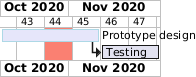 @startgantt printscale weekly 2020/10/26 to 2020/11/01 are colored in salmon Project starts the 2020-10-15 [Prototype design] as [TASK1] lasts 25 days [TASK1] is colored in Lavender/LightBlue [Testing] lasts 15 days [TASK1]->[Testing] @endgantt
