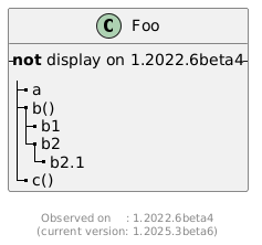 @startuml class Foo { -- **not** display on 1.2022.6beta4 -- |_ a |_ b() |_ b1 |_ b2 |_ b2.1 |_ c() } footer \nObserved on : 1.2022.6beta4\n(current version: %version()) @enduml