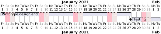 @startgantt saturday are closed and are colored in pink sunday are closed Project starts the 1st of january 2021 [Prototype design end] as [TASK1] lasts 19 days [Testing] lasts 4 days [TASK1]->[Testing] @endgantt