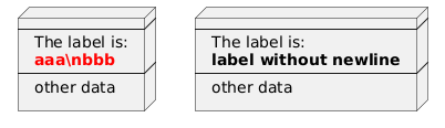 @startuml !procedure $foo($as, $label) node $as [ ---- The label is: <b>$label ---- other data ] !endprocedure $foo("a", "<color:red>aaa\nbbb") $foo("b", "label without newline") @enduml