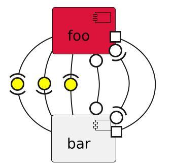 @startuml scale 2 skinparam ArrowLollipopColor yellow component foo #dc143c [bar] foo -(0)- bar foo -0)- bar foo -(0- bar foo 0--0 bar foo 0)--(0 bar foo #--# bar @enduml