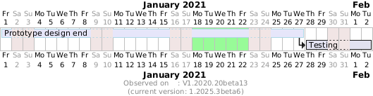@startgantt 'printscale weekly 2021-01-18 to 2021-01-22 are colored in palegreen saturday are closed sunday are closed Project starts the 1st of january 2021 [Prototype design end] as [TASK1] lasts 19 days [TASK1] is colored in Lavender/LightBlue [Testing] lasts 4 days [TASK1]->[Testing] footer Observed on : V1.2020.20beta13\n(current version: %version()) @endgantt