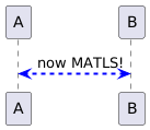 @startuml <style> ' scope to sequenceDiagram elements sequenceDiagram { arrow { .matls { ' MATLS Connections LineColor blue LineStyle 4 LineThickness 2 } } } } </style> participant A as a participant B as b a<-->b <<matls>>: now MATLS! @enduml