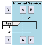 @startuml <style> sequenceDiagram { group { BackgroundColor transparent } } </style> participant D box "Internal Service" #LightBlue participant A participant B A -> B group test B -> D end end box B -> D @enduml
