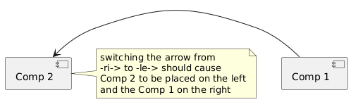 @startuml component "Comp 1" as component_1 { } component "Comp 2" as component_2 { } ' component_1 -ri-> component_2 component_1 -le-> component_2 note right of component_2: switching the arrow from\n-ri-> to -le-> should cause\nComp 2 to be placed on the left\nand the Comp 1 on the right @enduml