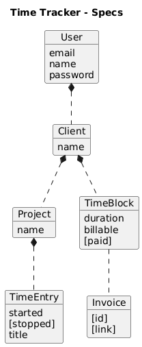 @startuml title Time Tracker - Specs object User { email name password } object Client { name } object Project { name } object TimeBlock { duration billable [paid] } object TimeEntry { started [stopped] title } object Invoice { [id] [link] } User *.. Client Client *.. Project Client*.. TimeBlock Project *.. TimeEntry TimeBlock .. Invoice @enduml