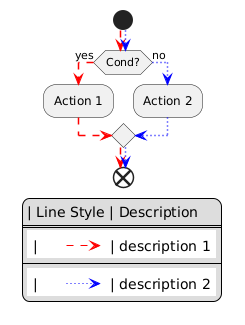 @startuml skinparam colorArrowSeparationSpace 3 !$style1 = "#red,dashed" !$style2 = "#blue,dotted" start -[$style1;$style2]-> if(Cond?)then(yes) -[$style1]-> :Action 1; -[$style1]-> else(no) -[$style2]-> :Action 2; -[$style2]-> endif -[$style1;$style2]-> end !procedure $code($styles, $descr) {{ label "| " as a label "$descr" as b a -[$styles]> b }} !endprocedure legend | Line Style | Description ==== $code($style1, "| description 1") ---- $code($style2, "| description 2") endlegend @enduml