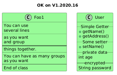 @startuml title **OK** on V1.2020.16 class Foo1 #palegreen { You can use several lines .. as you want and group == things together. __ You can have as many groups as you want -- End of class } class User #palegreen { .. Simple Getter .. + getName() + getAddress() .. Some setter .. + setName() __ private data __ int age -- encrypted -- String password } @enduml