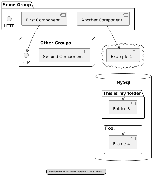 @startuml package "Some Group" { HTTP - [First Component] [Another Component] } node "Other Groups" { FTP - [Second Component] [First Component] --> FTP } cloud { [Example 1] } database "MySql" { folder "This is my folder" { [Folder 3] } frame "Foo" { [Frame 4] } } [Another Component] --> [Example 1] [Example 1] --> [Folder 3] [Folder 3] --> [Frame 4] legend <size:8> Rendered with Plantuml Version %version() </size> end legend @enduml