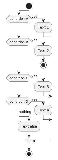 @startuml !pragma useVerticalIf on start if (condition A) then (yes) :Text 1; elseif (condition B) then (yes) :Text 2; stop elseif (condition C) then (yes) :Text 3; elseif (condition D) then (yes) :Text 4; else (nothing) :Text else; endif stop @enduml