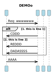 @startuml <style> group { LineThickness 1 } </style> skinparam shadowing false skinparam arrowThickness 2 skinparam sequenceMessageAlign left skinparam sequence { ArrowColor Black ParticipantBorderColor Black ParticipantBackgroundColor LightBlue ParticipantFontName Calibri } Title DEMOo participant ACTOR1 as R participant RESIDENCE as H participant SMALL as S participant Sno as E R->>H: Req: wwwwwww alt 1. this is line 1 H->>R: CDDD else 2. this is line 2 H->>R: REDDD H->>R: DADASSSS end R->>H: AAAA @enduml