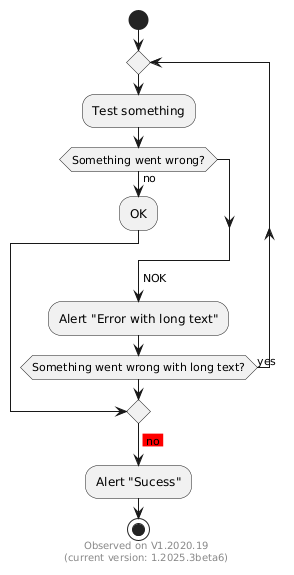@startuml start repeat :Test something; if (Something went wrong?) then (no) :OK; break endif ->NOK; :Alert "Error with long text"; repeat while (Something went wrong with long text?) is (yes) -><back:red> no ; :Alert "Sucess"; stop footer Observed on V1.2020.19\n(current version: %version()) @enduml