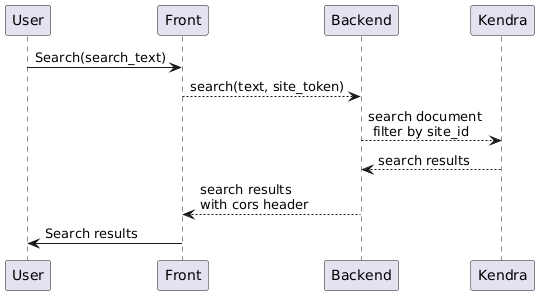 @startuml User -> Front: Search(search_text) Front --> Backend: search(text, site_token) Backend --> Kendra: search document \n filter by site_id Kendra --> Backend: search results Backend --> Front: search results\nwith cors header Front -> User: Search results @enduml
