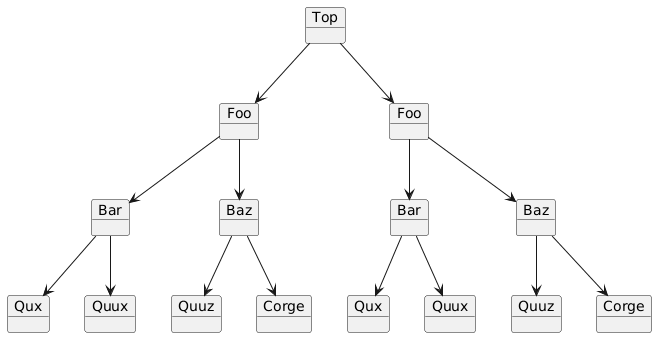 @startuml !procedure myGroup($i) object "Foo" as Foo##$i object "Bar" as Bar##$i object "Baz" as Baz##$i object "Qux" as Qux##$i object "Quux" as Quux##$i object "Quuz" as Quuz##$i object "Corge" as Corge##$i Foo##$i --> Bar##$i Foo##$i --> Baz##$i Bar##$i --> Qux##$i Bar##$i --> Quux##$i Baz##$i --> Quuz##$i Baz##$i --> Corge##$i !end procedure object Top myGroup(1) myGroup(2) Top --> Foo1 Top --> Foo2 @enduml