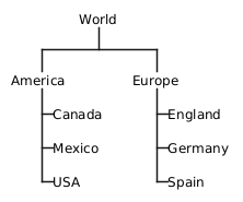 @startwbs *_ World **_ America ***_ Canada ***_ Mexico ***_ USA **_ Europe ***_ England ***_ Germany ***_ Spain @endwbs