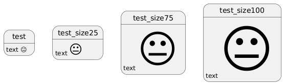 @startuml test: text 😐 test_size25: text <size:25>😐 test_size75: text <size:75>😐 test_size100: text <size:100>😐 @enduml