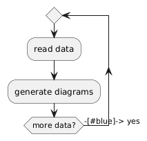 @startuml repeat :read data; :generate diagrams; repeat while (more data?) is (-[#blue]-> yes) @enduml