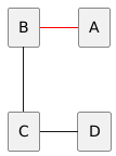 @startuml rectangle A rectangle B rectangle C rectangle D B -[#ff0000] A B -- C C - D @enduml