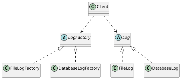 @startuml abstract LogFactory abstract Log class FileLog class DatabaseLog class FileLogFactory class DatabaseLogFactory LogFactory <|.. FileLogFactory LogFactory <|.. DatabaseLogFactory Log <|.. FileLog Log <|.. DatabaseLog class Client Client ..> LogFactory Client ..> Log @enduml
