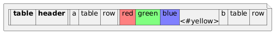 @startuml file f [ |= |= table |= header |\n| a | table | row |\n|<#FF8080> red |<#80FF80> green |<#8080FF> blue |\n<#yellow>| b | table | row | ] @enduml