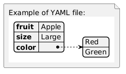 @startuml file n [ Example of YAML file: {{yaml fruit: Apple size: Large color: - Red - Green }} ] @enduml