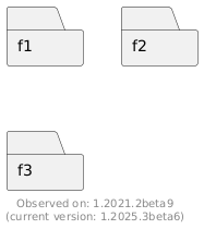 @startuml folder "f1" as f1 folder "f2" as LOOOOOOOOOOOng_f2 folder "f3" as LOOOOOOOOOOOOOOOOOOOOOOOOOOng_f3 footer Observed on: 1.2021.2beta9\n(current version: %version()) @enduml