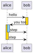 @startuml alice -> bob: hello activate bob #gold bob -> alice --++ #gold: you too activate alice #LightSkyBlue alice -> bob: step deactivate alice alice -> bob: step deactivate alice @enduml